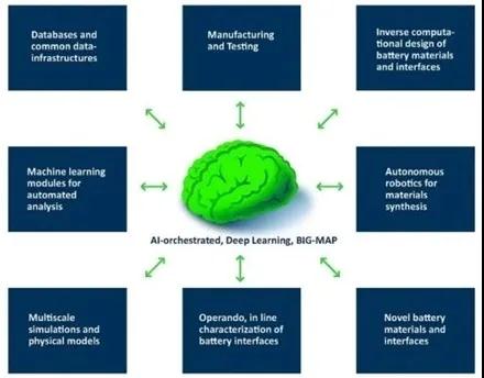 从能源技术的生产,存储到最终交付使用,材料的发现和开发始终贯穿于整个过程。特别对于新兴的电池技术,先进材料几乎是所有清洁能源创新的基础。若依靠现有的传统重复性试验开发过程,需要耗费大量的时间,人力物力去开发新型高性能电池材料并用于电池设计,这一过程从最初发现到完全实现商业化可能长达10年之久。因此,在《电池2030+》项目中,为了加速超高性能的,可持续发展的智能型电池开发,计划在欧洲范围内设立电池“材料加速平台(MAP)”,并与电池界面基因组(BatteryInterface Genome,BIG)集成在一起。同时BIG-MAP基础设施模块化设置,全系统具有高度的通用性,以便能够容纳所有新兴的电池化学体系,材料成分,结构和界面。另一方面,MAP将利用人工智能(AI)从许多互补的方法和技术中集成和编排数据,整合计算材料设计,模块化和自主性综合机器人技术和先进表征,实现全新的电池开发策略。促进材料,工艺和设备的逆向设计和定制。最终,在MAP框架下由每个核心元素构建概念电池,开发出具有突破性的电池材料,极大提高电池开发速度和电池性能。