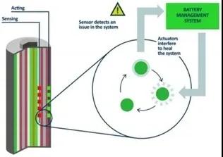 电池技术的可持续发展以及我们对电池普及应用的日益依赖,要求确保其具有很高的可靠性和安全性。其中探测或者传感不可逆变化是获得更好的可靠性第一步。但是,要真正确保可靠性,电池应该能够自动感知损坏,并恢复原始配置及其整体功能。那我们可以尝试模仿自然愈合机制(比如伤口愈合)来制造智能长寿命电池吗?《电池2030+》中借鉴医学领域中“再生工程”的理念,提出可以开发在电池内注入相应自愈合功能的材料,以恢复电极内部的缺陷。另一方面,提出将状态传感和自我愈合功能紧密相连(如图6所示)。从传感器检测到的信号将被发送到电池管理系统并进行分析,如果出现问题,BMS将发出信号发送给执行器以触发自我愈合过程的刺激。这种既自我感知又触发自修复的结合过程将赋予电池更高的安全性和消费者更高的使用可靠性。