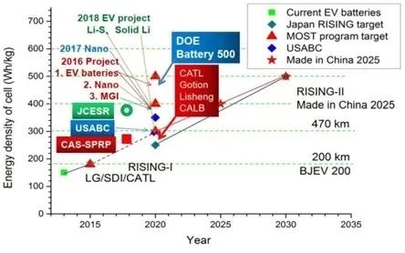 中国现在是全球发表电池研究论文最多的国家。但同时在工业界也定义了两个并行的研究和创新战略:进化战略和创新战略。进化战略专注于优化现有搭载新能源电池的车辆和能源动力总成系统,包括电池性能的提升(高安全,快速充电,低耗电量等)。而革命性战略的目标是开发下一代电池化学体系用于车辆动力总成系统。如图9所示,可以比较2015年至2035年中国的电池发展目标与日本新能源产业的技术综合开发机构(NEDO)的RISING计划目标,以及美国能源部(DOE)的Battery 500计划。
