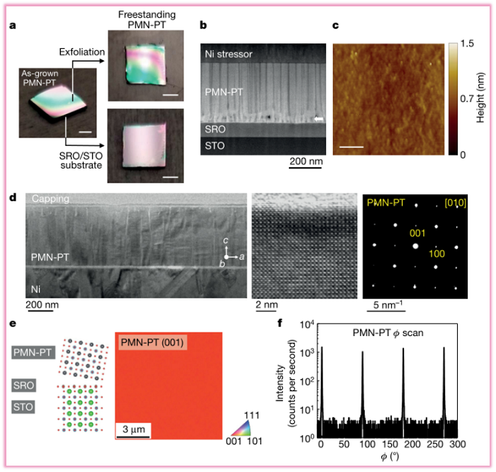美国麻省理工学院Jeehwan Kim教授和威斯康辛大学麦迪逊分校Chang-BeomEom教授团队演示了一种通用的机械剥离方法,用以生产独立的单晶膜,包括各种具有不同晶体取向的钙钛矿,尖晶石和石榴石晶体结构的各种复杂的氧化复合物。此外,研究人员制备了人工异质结构,并通过直接堆叠这种具有不同晶体结构和取向的独立式薄膜来杂化它们的物理性质,这是传统方法无法做到的。该研究结果建立了一个类似于二维材料异质结构的叠加和耦合三维结构的平台,用以增强器件的性能。