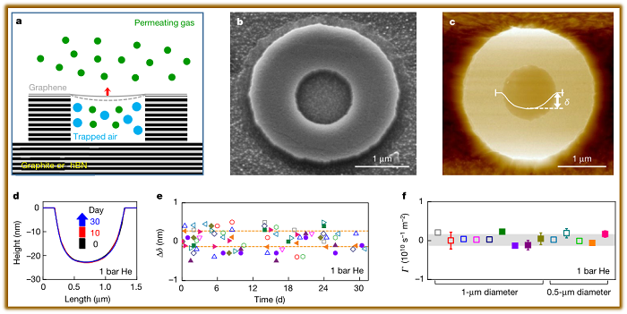 英国曼彻斯特大学诺奖得主A. K. Geim教授团队使用小的石墨烯密封的单晶容器,研究发现无缺陷的石墨烯是不透水的,其精确度比之前的研究高出8-9个数量级。研究人员能够辨别出每小时只有几个氦原子的渗透,这个检测限也适用于除了氢的所有其他测试气体(氖、氮、氧、氩、氪和氙)。尽管氢分子比氦分子大,并且要经历一个更高的能量屏障,但它仍表现出明显的渗透。这异常的结果归因于两阶段的过程,涉及在高催化活性的石墨烯波纹处解离氢气分子,紧随其后的是吸附的氢原子以相对较低的活化能跃迁到石墨烯片的另一侧。该研究工作为二维材料的抗渗性提供了一个关键的参考,从基础研究的角度和它们的潜在应用都具有重要意义。