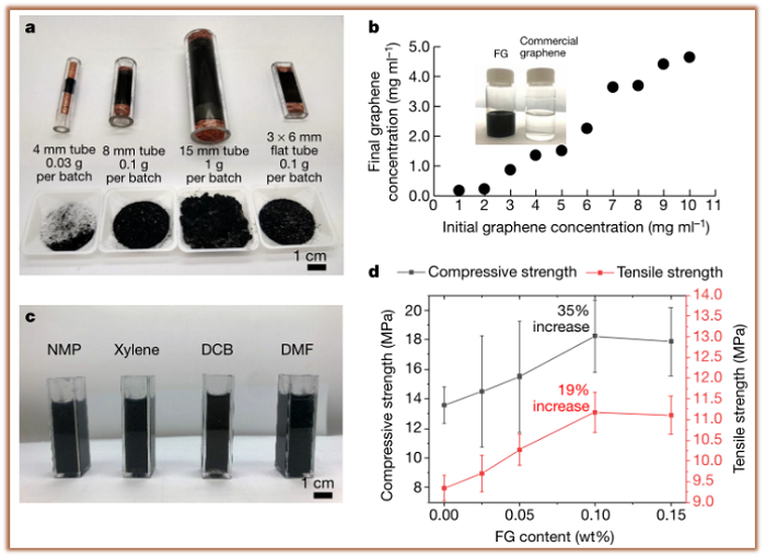 美国莱斯大学Rouzbeh Shahsavari教授团队、Boris I. Yakobson教授团队和James M. Tour教授团队展示了通过焦耳加热廉价碳源——如煤、石油焦、生物炭、炭黑、废弃食品、橡胶轮胎和混合塑料废物,可以在不到一秒的时间内合成大量的石墨烯。该产品以其生产工艺命名为快速制备的石墨烯(FG),显示了在堆叠的石墨烯层之间的涡轮增压排列。快速合成工艺不需要加热炉,不需要溶剂以及反应性气体。而产量取决于原料的碳含量,当使用高碳源,如炭黑、无烟煤或煅烧过的焦炭时,产量可达80%-90%,纯度大于99%,且无需任何净化处理。拉曼光谱分析显示FG存在一个低强度或缺失的D谱带,这表明FG具有极低的缺陷浓度,并证实了FG的涡轮应变堆积。FG层的无序取向有利于其在复合材料形成过程中混合后迅速剥落。合成FG的电能成本仅为每克7.2千焦,这使得FG适合用于塑料、金属、胶合板、混凝土和其它复合材料。