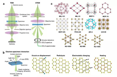 图1. (a) TEM和STEM模式下的电子束路径示意图。(b)电子-试样相互作用和光束损伤。EELS、EDS、CL、SE和BSE分别是电子能量损失光谱、能量色散x射线光谱、阴极发光、二次电子和背散射电子。(c)在此观点中讨论的MOF晶体结构。