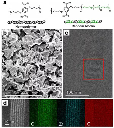 最近开发的基于MOF的材料的一个有趣的子集是MOFs,其中有机成分是聚合物配体,而不是分子有机配体(图3a)。这些所谓的polyMOFs提供了将MOF和聚合物的材料特性结合起来的潜力。此外,与分子衍生的对应物MOF相比,polyMOFs显示出极不寻常的大块晶体形态(图3b)。虽然一些研究检查了聚合物结构和骨架特性对最终晶体形态的影响,但直到最近才对这些材料的内部结构进行了研究。在对聚合物进行超薄切片后,TEM成像观察到由嵌段聚合物构建的UiO-66基聚合物内部结构中的富金属和缺金属畴的交替层(图3c)。通过EDS图谱的进一步分析,证实了Zr(IV)在高浓度和低浓度之间交替出现,表明MOF和无金属非晶态层有明显的区别。
