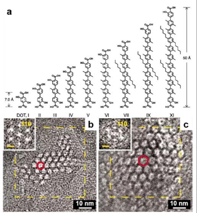 图2.(a)点链接器的结构。(b)IRMOF-74-VII和(c)IRMOF-74-IX的HRTEM,在原始图像中插入虚线正方形区域的FFT图案。