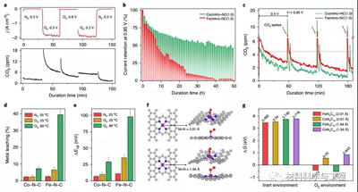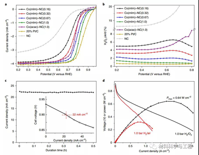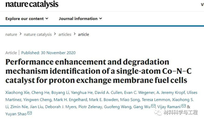 近日,来自纽约州立大学Xiaohong Xie的等人在《Nature Catalysis》报告了一种原子分散的Co和N共掺杂碳(Co–N–C)催化剂,其催化氧还原反应活性与用类似方法合成的Fe–N–C催化剂相当,但耐用性是后者的四倍。另外,Co-N-C催化剂在1.0 bar的H2/ O2气体压力以及0.9V的开路电压的条件下测得的电流密度为0.022A cm-2、峰值功率密度为0.64 W cm-2。本文确定了金属(M)–N-C催化剂的两种主要降解机理:自由基对催化剂的氧化作用和活性位的脱离金属作用。Co–N–C相对于Fe–N–C的耐久性的提升主要是由于Co离子在Fenton反应中的活性较低。Fenton反应从主要的氧还原反应副产物H2O2产生自由基,并且显着增强了Co–N–C的脱离金属的能力。