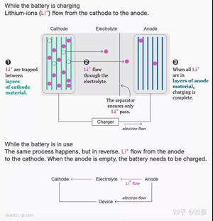 我们目前最前沿的电池化学是锂离子。大多数专家都同意,在至少十年或更长的时间里,没有其他化学物质会破坏锂离子。锂离子电池有两个电极(阴极和阳极),中间有一个分离器(一种可以传导离子而不是电子的材料,旨在防止短路),还有一个电解质(通常是液体),使锂离子在电极之间来回流动。当电池充电时,离子从阴极移动到阳极;当电池供电时,离子向相反的方向移动。