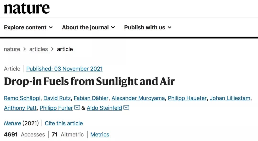 Remo Schäppi, et al. Drop-in Fuels from Sunlight and Air. Nature, 2021.