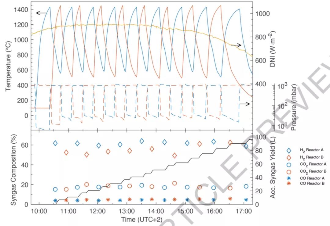 研究人员同时实施了该计划的各个步骤,演示了整个热化学太阳能燃料生产链的运行,从直接从环境空气中捕获的H2O和CO2到运输燃料(如甲醇、煤油)的合成,采用模块化的5千瓦中试规模太阳能系统在实际现场条件下运行。