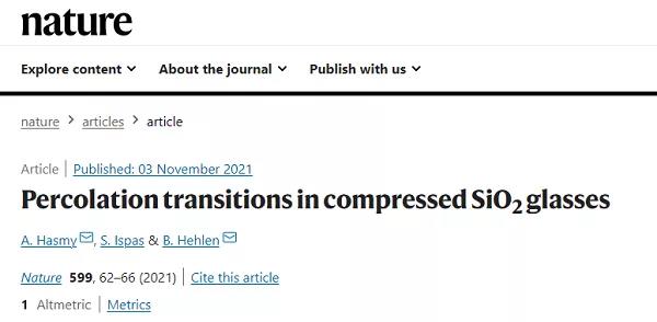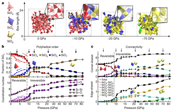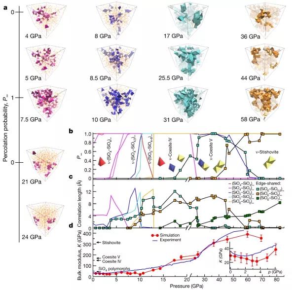 法国蒙彼利埃大学A. Hasmy一作加通讯,报道了基于可压缩二氧化硅(SiO2)玻璃的从头计算,表明从低密度到高密度无定形结构的结构变化是通过一系列逾渗转变发生的。当压力增加到82 GPa 时,一系列由共享角或边的四面体、五面体和最终八面体组成的长程(“无限”)逾渗簇在临界压力下出现并取代之前的“相” ,折叠协调多面体和较低的连通性。这种机制为众所周知的3 GPa附近的机械异常以及超过10 GPa的结构不可逆性等特征提供了自然的解释。本工作结果表明,逾渗理论提供了一个强大的框架来理解无定形-无定形转变的性质和途径,并开辟了一条新的途径来预测非晶态固态及相关液相。相关论文以题为“Percolation transitions in compressed SiO2 glasses”发表在nature上。
