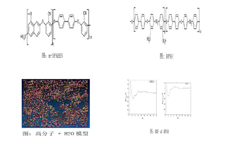高分子电解质膜拥有很好的离子交换能力,但是其分子链中亲水官能团摄取了过量水分子 后电解质膜的离子交换能力急剧下降。 磺化聚(芳醚醚腈)(m-SPAEEN)共聚物相比于其他油膜具有更好的减少水的摄取功能, 如比具有相同离子交换能力的聚砜和聚酮。造成上述区别主要是腈基团的影响。Takahiro 等通过一系列分子动力学计算,研究了腈基团对聚合物电解质膜在燃料电池应用中的影响。 并比较了 m-SPAEEN 和磺化聚(芳醚砜)(BPSH)的分子动力学计算结果。结果表明水分子 的水合作用不仅发生在 m-SPAEEN 分子的磺酸基团,而且还会发生在共聚物的其他亲水基团 上。水合发生在 m-SPAEEN 分子的腈基团和 BPSH 分子的磺酸基团是不同的:前者会比后者 摄取更少的水分子。因此 m-SPAEEN 的水摄取能力比较低。