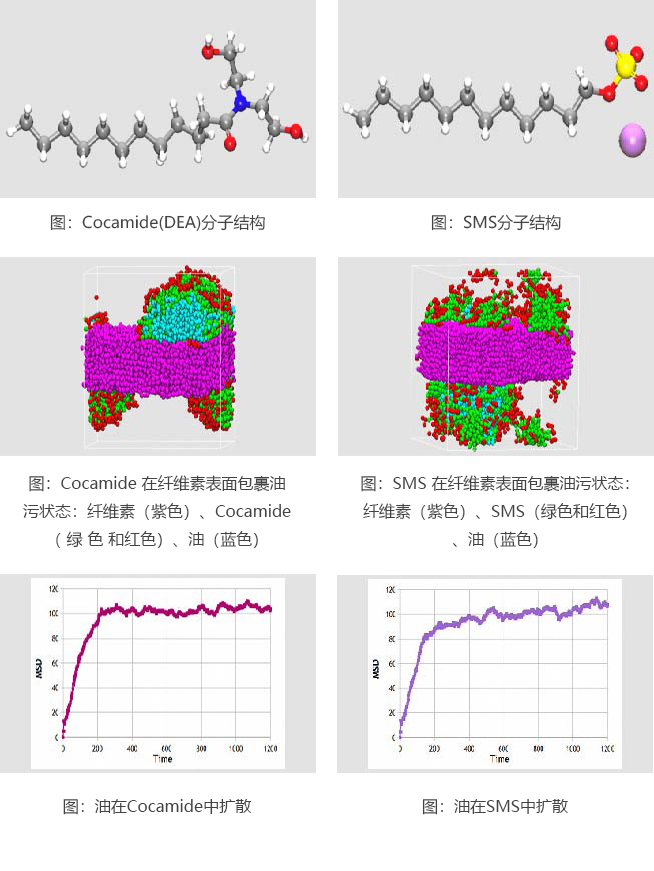 表面活性剂分子一端是极性、另一端是非极性,它们在水溶液中自发团聚成相应的结构, 如胶团、双层结构和泡囊。 在临界胶体浓度以上会形成球形胶体结构,随着胶体的浓度增 加胶体的外形也会发生改变,如球形到圆柱形、六角形和层状相。 我们研究了两种表面活性剂:离子型SDS表面活性剂和非离子型表面活性剂cocamide(DEA)。 上述两种表面活性剂是目前最常用的洗涤剂配方,研究其在纤维素表面去除油层效果。