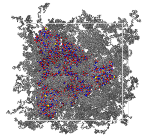 Figure 1: Model of COVID-19 spike protein in a Polyethylene matrix. Protein is displayed in CPK, Polyethylene matrix in wire mode. Present water molecules are not displayed for clarity.