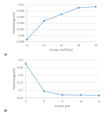 图2为系统总能与截断能和K点密度关系图,图2a是截断能,图2b是K点密度。截断能为18eV、K点密度为8X8X8时总能量的收敛已经在1emV之内。