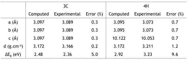 表1:为3C-SiC与4H-SiC的晶胞参数、密度、带隙的计算与实验数值的对比