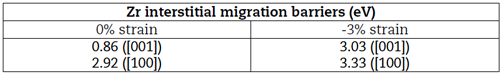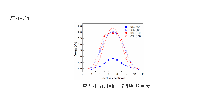 Zr间隙原子在ZrO2中迁移是各向异性,[001]方向是最佳迁移方向。主要是氧原子的偏移导致的;应力对Zr间隙原子迁移影响巨大。