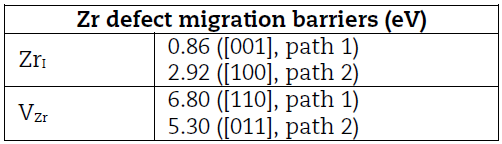 Zr合金是目前核反应堆的主要的燃料包覆材料。其中水侧腐蚀是Zr合金最主要的退化机制。氧化物在ZrO2中的输运决定腐蚀动力学。阳离子向外扩散有助于形成氧化物保护层。采用温度加速动力学和MD方法研究了Zr缺陷在ZrO2四面体间隙位置中迁移行为。间隙Zr在四方相ZrO2具有各向异性扩散性,适合[001]或C方向迁移。压应力显著提高间隙Zr原子的迁移能垒。间隙Zr原子在晶界迁移速度明显低于块体氧化物中。