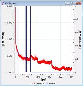 点击Distrbutions按钮,显示Distribution graph,在图表中您可以观察到分子种类随着时间的分布和模拟的热力学性质。分布图表仅在勾选分子种类表格中对应的分子种类才显示。点击表格的第二排显示丙烯分布。您可以观察到丙烯分子在135ps后完全分解了。这是对氧化反应的初始时的估计。为了得到更多细节,可选用更小的步长(0.1fs),同样的模拟应该通过很多不同的起始构型来模拟,以增强统计结果的有效性。