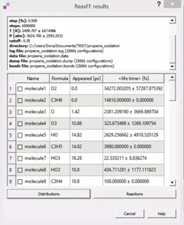 设置键截断半径为0.35,勾选eliminate instable intermediates,检查晶胞,清除只出现一次画面的种类。当LAMMPS模拟结束时,ReaxFF result对话框出现(如下图所示),项目管理栏里出现一个新的名为 propene_oxidation 的项目。模拟过程中检测的分子会列在对话框主表格内(分子种类表格)。对于每一个分子都有相应的模型以同样的名称出现在reaxff项目里。请注意分子是按照出现时间的先后排列的。