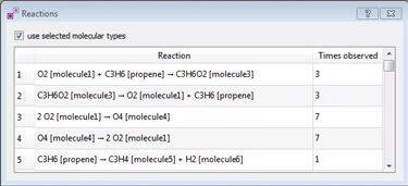 点击Reactions按钮,显示反应表格,列出所有检测到的反应。如果use selected molecular types勾选了 ,只有涉及到分子种类表格中勾选的分子种类的反应才会呈现出来。