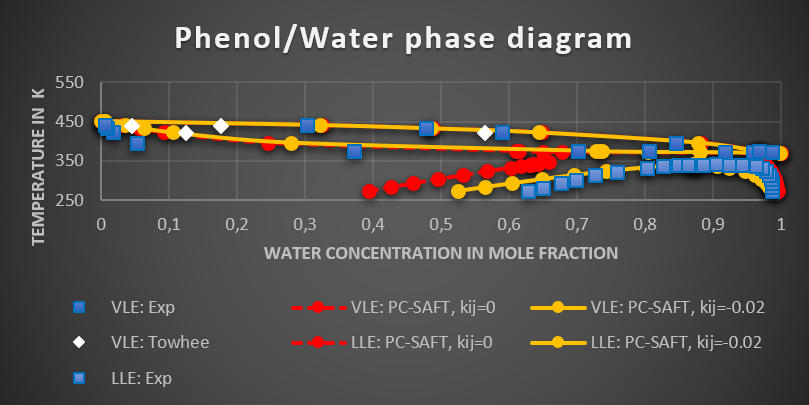 利用MAPS SciTherm模块实现的基于PC-SAFT(扰动链统计关联流体理论)的状态方程模型,计算水/苯酚混合物的二元相图。MAPS Towhee模块用于执行蒙特卡洛(MC)模拟,以生成额外的数据来改进PC-SAFT预测。