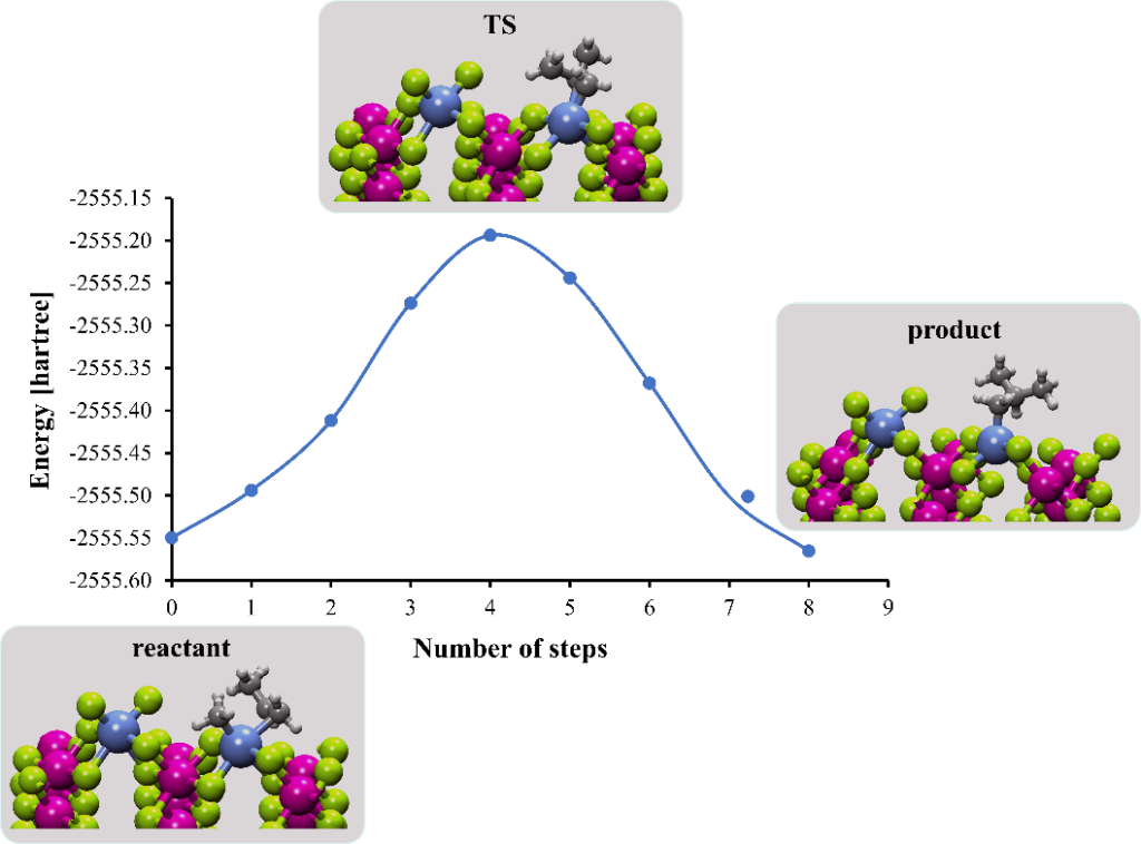 在本研究案例中,我们基于密度泛函理论,利用MAPS软件的Quantum Espresso模块对齐格勒纳塔催化聚合聚丙烯的初始反应进行了考察。过渡态搜索采用NEB方法。层结构模型的结构优化采用超软赝势,平面波密/密度截断设置为900/9000 eV,G点采样,PBE交换关联泛函及半经验Grimme D2色散校正。