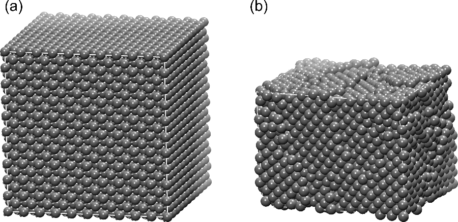 Figure 1:将Al沿x轴暴露于机械压力后的初始(a)及最终(b)构象