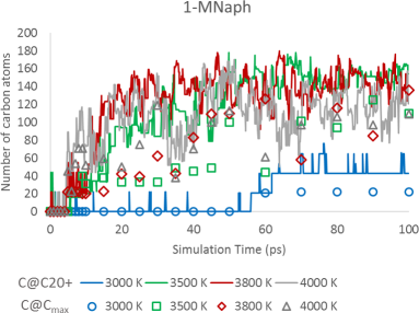 PAHS 的热分解经常伴随炭黑或烧炭的产生。甲基取代基的位置不仅影响动力学性质,而且严重影响反应的热力学性质。甲基取代基的数目直接影响奈衍生物的数量,而其位置主要影响动力学性质,即甲基取代基在某些位置加速反应进行。炭黑的生成分三步骤:i) 奈衍生物的活化,ii) 活化混合物的二聚或三聚反应,iii) 凝聚,而温度对凝聚过程有很大影响。