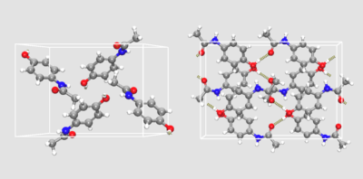 图:扑热息痛晶体结构;左:第一种晶型,P21/a 对称性;右:第二种晶型,Pbca 对称性