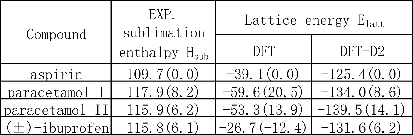 表:晶格能量的计算值(DFT 和 DFT-D2)与实验值比较;括号中是相对于阿司匹林的晶格能量值