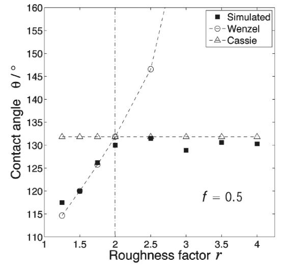 手机屏保、包装材料设计等实际应用中准确描述材料与液体之间亲和关系很重要。我们采用 MD 方法描述了具有一定粗糙度的表面与液滴之间的接触角。结果表明,接触角与表面粗糙度、表面类型和表面比例有密切关系。