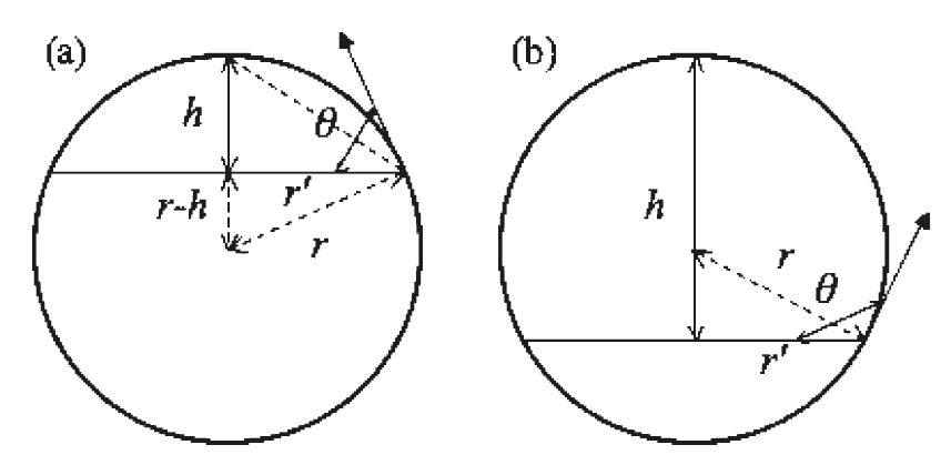 图:接触角 θ 预测模型,(a) 液滴高度 h 小于原液滴半径 (h
